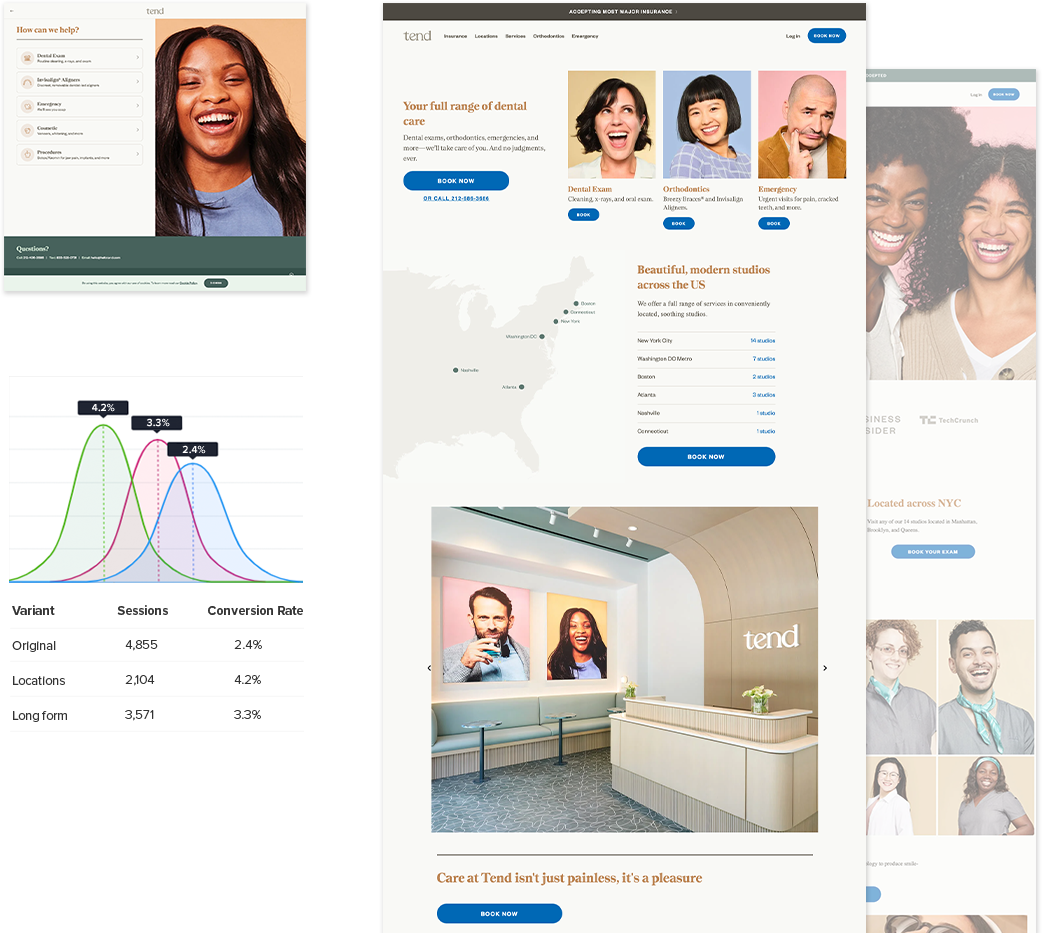 Tend’s performance marketing success relies on users making dental appointments online. This online booking workflow, while effective, is also complex and requires users to complete multiple steps and make multiple decisions in order for an actual conversion to occur. OpenMoves provided Tend with extensive analysis surrounding conversion rate optimization to ensure that SEM traffic converted efficiently.