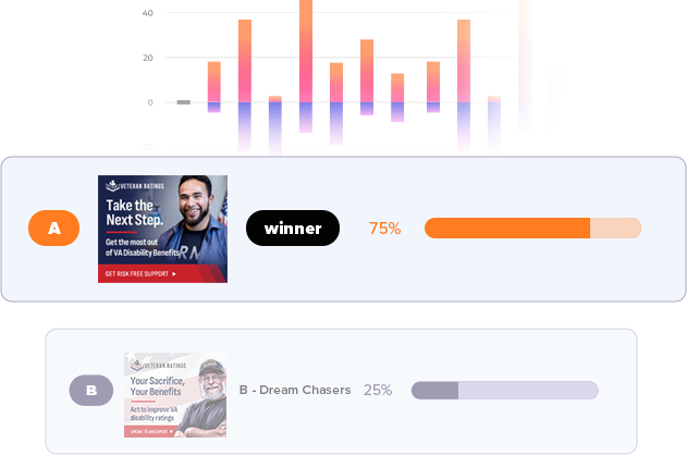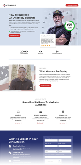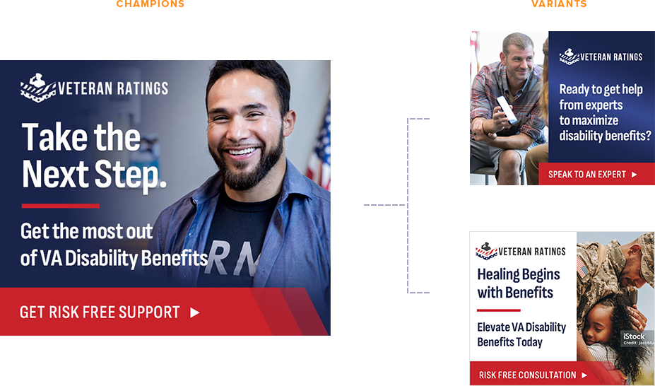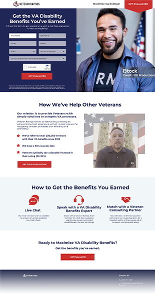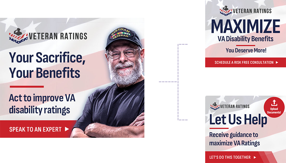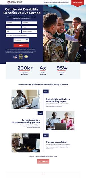 The objective of the campaign was to drive qualified leads through paid channels to the Veteran Ratings team, who would then contact each lead to determine eligibility for services. Success in this objective required a complex balance of factors which often counterbalance each other: total lead volume, cost per individual lead, and lead qualification rate. The goal was to deliver appropriate lead volume, at or below a given target CPA, while also maintaining and improving lead-to-customer quality rates.